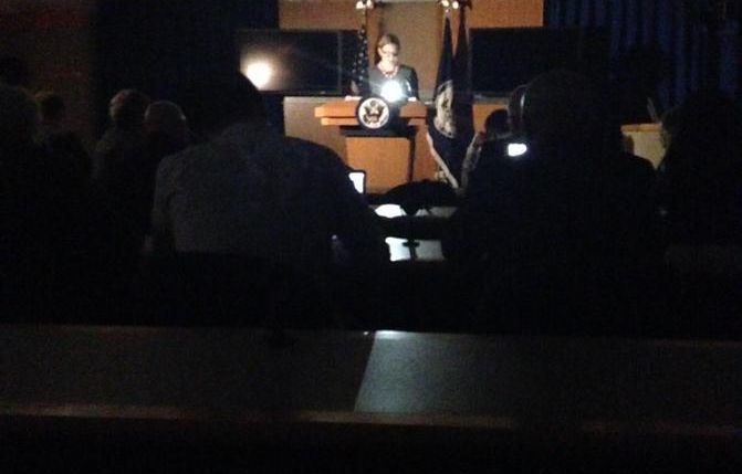 В «Bloomberg» пишут о завершении брифинга Мари Харф в Государственном департаменте «в темноте». Издание указывает, что подача электроэнергии прекратилась из-за скачка напряжения на линии электропередач. Об этом сообщили из энергетической компании «Pepco» (не путать с «Pepsico»), причём… через «Twitter».