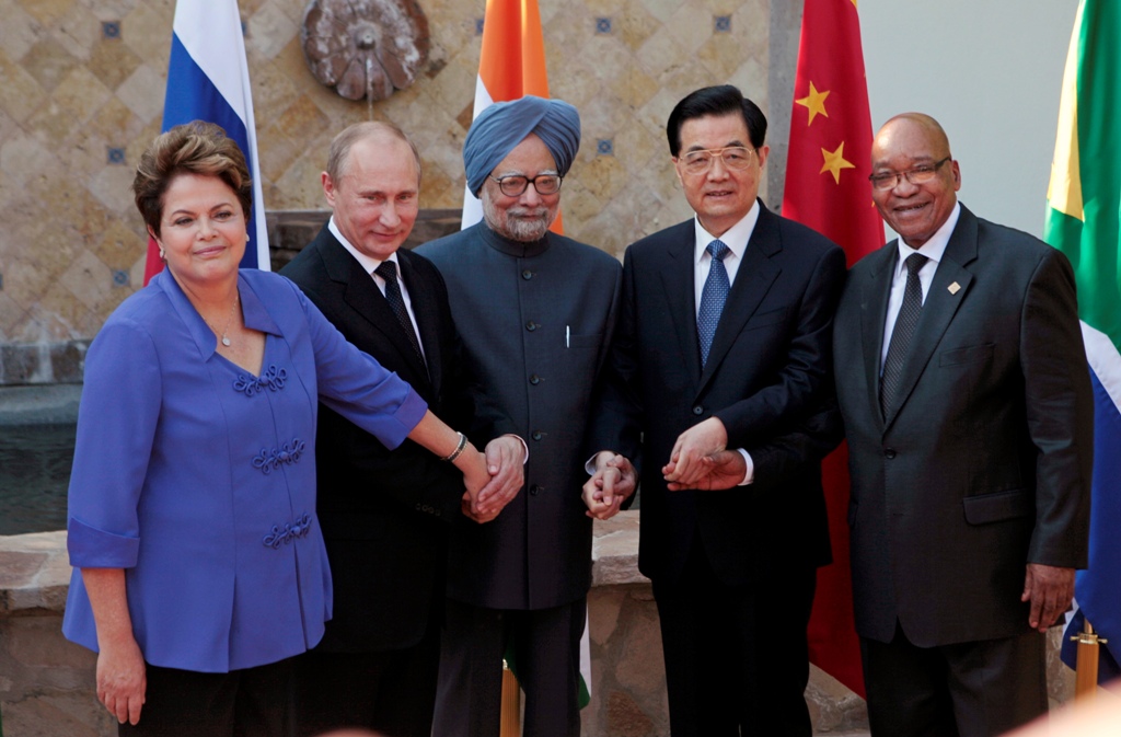 (L-R) Brazil's President Dilma Rousseff, Russia's President Vladimir Putin, India's Prime Minister Manmohan Singh, China's President Hu Jintao and South African President Jacob Zuma pose for a picture after a BRICS leaders' meeting in Los Cabos June 18, 2012.  The leaders are in Los Cabos, Mexico, for the G20 Summit.     REUTERS/Victor Ruiz Garcia (MEXICO - Tags: POLITICS) - RTR33TPF