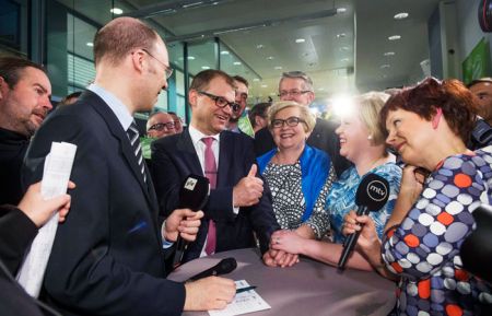 Снимок в открытие статьи: лидер партии «Финляндский центр» Юха Сипиля (в центре) после итогов выборов в Хельсинки, Финляндия, 19 апреля 2015 года / Фото: EPA/ ТАСС