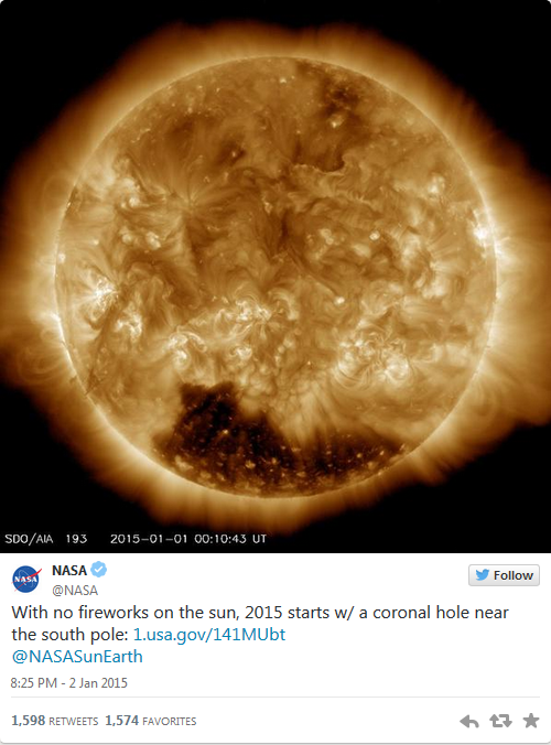 Фотография, на которой отчётливо видна одна из таких дыр в районе южного полюса звезды, была опубликована в официальном микроблоге NASA в Twitter.